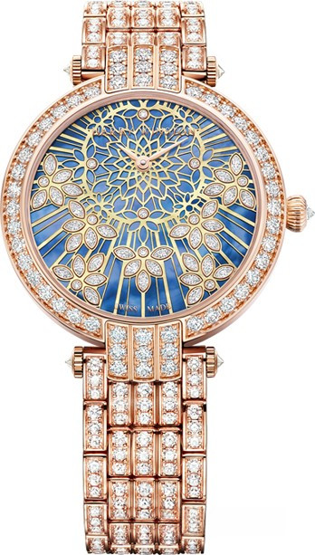 Часы Premier Lace 36 mm имеют два знаковых узора, символизирующих абсолютную женственность своим собственным уникальным способом: кружево – драгоценность и тонкость, символизм вечного времени; и перламутр – символ нежности и чистоты. Часы увлекательные и таинственные, с мерцающим золотым кружевом на синем жемчужном циферблате, украшенным белыми бриллиантами. Элегантный узор выполнен из розового золота толщиной всего в 0,15 мм. Ремесленники мануфактуры создают настоящие арабески из света и тени. Корпус часов изготовлен из розового золота 18к. Корпус инкрустирован белыми бриллиантами. В часы помещен автоматический Калибр HW2014 с механизмом индикации часов и минут. Браслет из розового золота 18к, инкрустированный белыми бриллиантами.