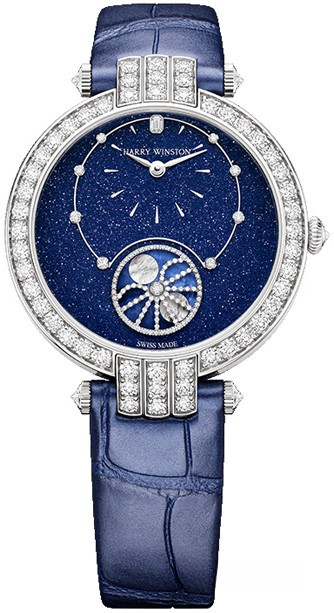 Часы Harry Winston Premier Moon Phase 36 mm выпущены в корпусе из белого золота 18к, размером 36 м и водонепроницаемостью 30 м. Внутри корпуса установлен автоматический механизм, Калибр HW3102. На синем авантюриновом с белыми бриллиантами циферблате отображаются часы, минуты, фаза луны. Часы комплектуются ремешком из кожи аллигатора с вставкой из белого золота 18к. Корпус инкрустирован белыми бриллиантами.