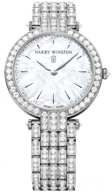 Часы Harry Winston Premier 36 mm выпущены в корпусе из белого золота 18к, размером 36 мм и водонепроницаемостью 30 м. Внутри корпуса установлен кварцевый механизм, Калибр HW1042. На белом жемчужном циферблате отображаются часы, минуты. Часы комплектуются браслетом из белого золота 18к, инкрустированным белыми бриллиантами. Корпус инкрустирован белыми бриллиантами.