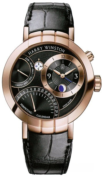 Часы с вечным календарем и функцией второго часового пояса Harry Winston Premier Perpetual Calendar представлены в корпусе из розозвого золота 18к размером 41 х 10.9 мм водонепроницаемостью 30 метров. Внутри корпуса установлен автоматический механизм с запасом хода 45 часов. На черном циферблате отображаются часы, минуты, секунды, дата, месяц, цикл високосного года, фаза луны. Часы комплектуются ремешком из кожи аллигатора с вставкой из розового золота 18к. Модель выпущена ограниченной серией 75 штук.