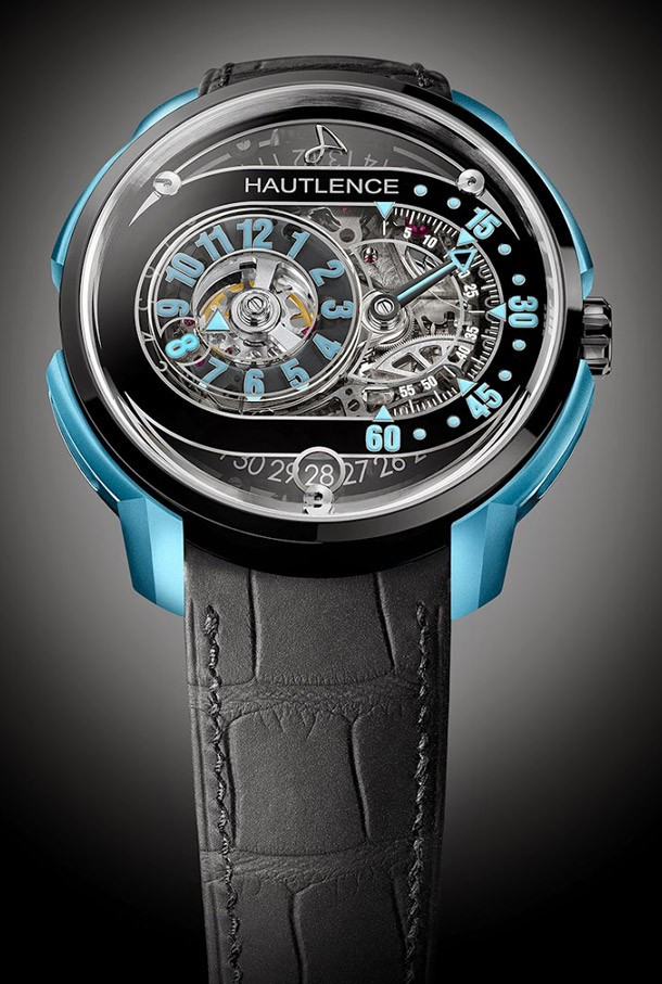 Часы Hautlence Avant - Garde - HLRQ04 - корпус размером 44 мм изготовлен из нержавеющей стали (безель и кнопки, выступы/наконечники, заводная головка) и титана (боковая и задняя части корпуса). Часовой мануфактурный механизм с ручным заводом Hautlence HLQ обеспечивает функционал, включающий прыгающие сателлиты и ретроградную минутную стрелку. Механизм состоит из 255 отдельных компонентов и обеспечивает 40 часов запаса хода. Выступы корпуса покрыты синим лаком. Часы комплектуются ремешком из кожи аллигатора с титановой застежкой. Водонепроницаемость до 30 метров.