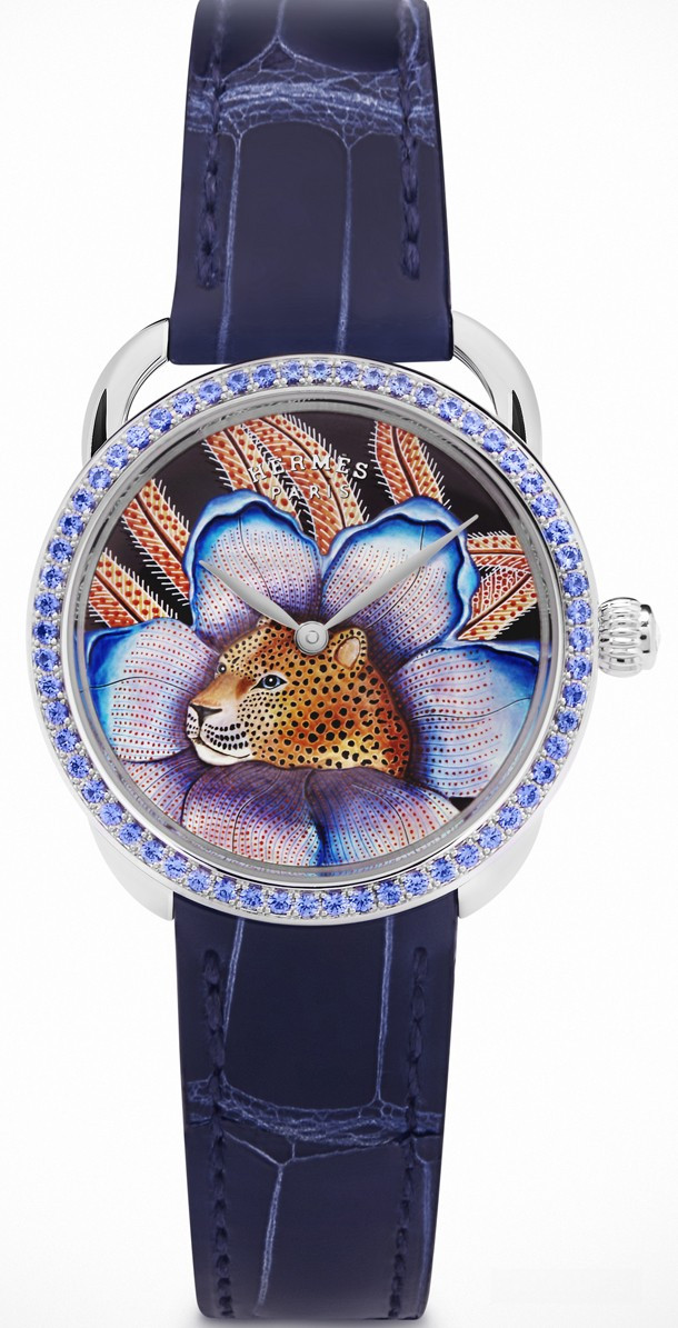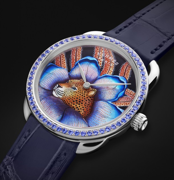 Часы Hermes Arceau Baobab Cat выпущены ограниченной серией из 12 пронумерованных экземпляров. Корпус диаметром 34 мм изготовлен из белого золота 18к и отделан 60-ю голубыми сапфирами общим весом 0.8 карат. Специальное покрытие защищает сапфировое стекло от бликов. Заводная головка инкрустирована бриллиантом огранки «роза» весом 0.07 карата. Водонепроницаемость корпуса составляет 30 метров. В основе циферблата лежит оникс с миниатюрой ручной работой, накладным элементом из перламутра с гравировкой и миниатюрой ручной работы. Расстояние между ушками – 17 мм. Часы комплектуются мануфактурным Калибром Hermès H1912 с автоматическим заводом. Механизм изготовлен в Швейцарии. Калибр толщиной 3.7 мм обладает запасом хода 50 часов, балансовая частота 28 800 пк/час. Механизм поддерживает отображение часов и минут при помощи центральных стрелок. Новинка поставляется на ремешке из гладкой кожи аллигатора цвета синего сапфира с застежкой из белого золота 18к.