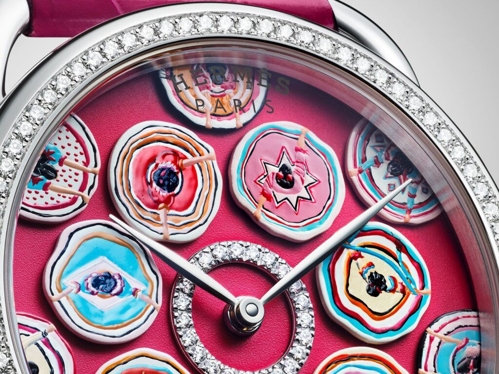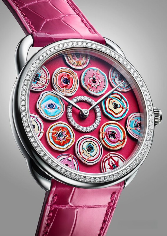 Часы Hermes Arceau Belles du Mexique представлены в корпусе размером 38 мм из белого золота 18к водонепроницаемостью 30 метров. Внутри корпуса установлен автоматический механизм, Калибр Н1912, обладающий запасом хода 50 часов. На розовом циферблате с белымимбриллиантами отображаются часы, минуты. Часы поставляются на ремешке из кожи аллигатора с золотой застежкой. Безель из белых бриллиантов.