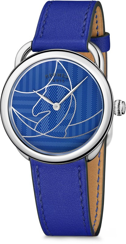 Часы Hermes Arceau Casaque 36 mm представлены в корпусе из нержавеющей стали диаметром 36 мм водонепроницаемостью 30 метров. Внутри корпуса установлен кварцевый механизм. На синем гильошированном циферблате отображаются часы и минуты. Часы поставляются на кожаном ремешке с вставкой из нержавеющей стали.