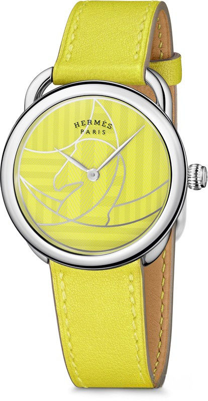Часы Hermes Arceau Casaque 36 mm представлены в корпусе из нержавеющей стали диаметром 36 мм водонепроницаемостью 30 метров. Внутри корпуса установлен кварцевый механизм. На желтом гильошированном циферблате отображаются часы и минуты. Часы поставляются на кожаном ремешке с вставкой из нержавеющей стали.