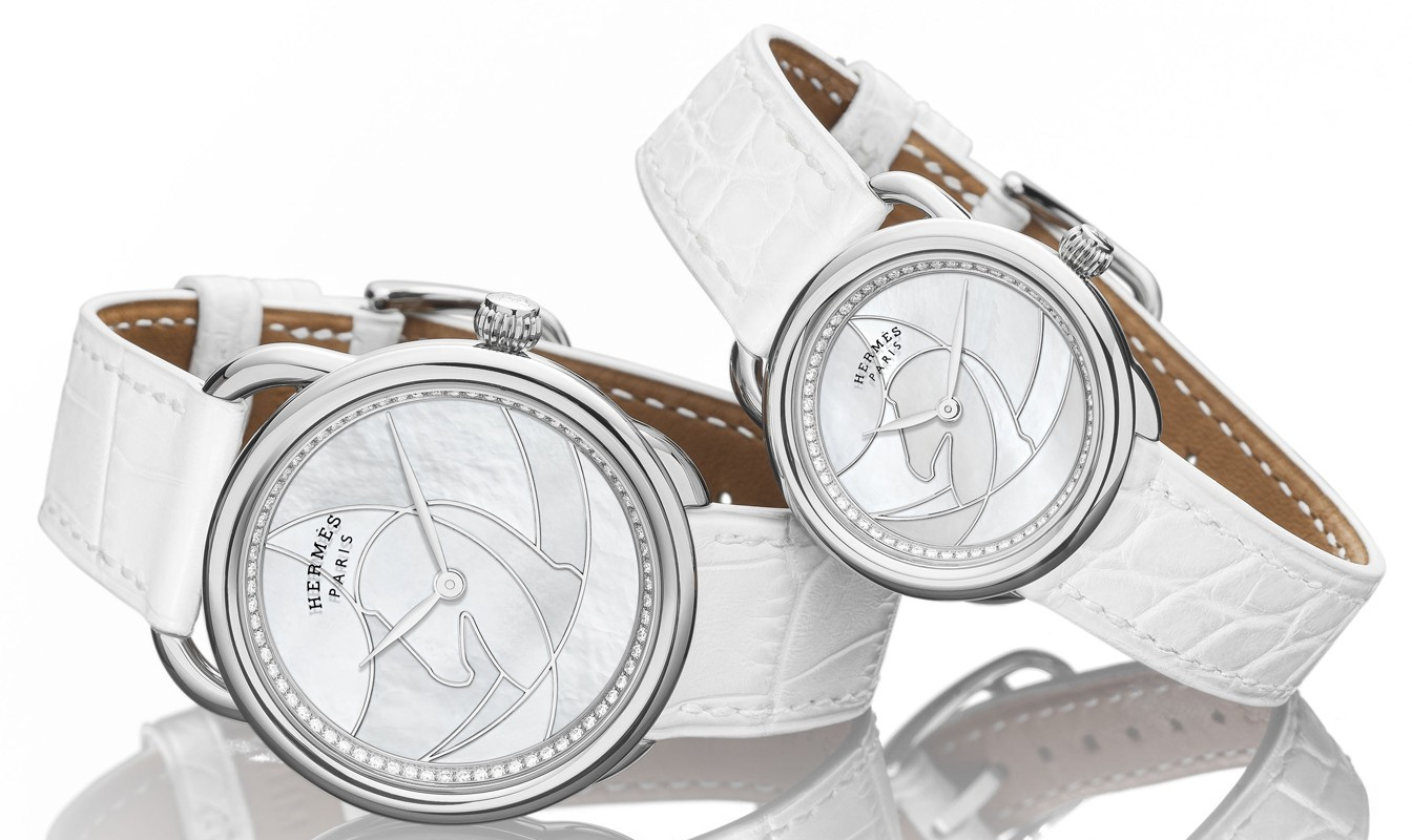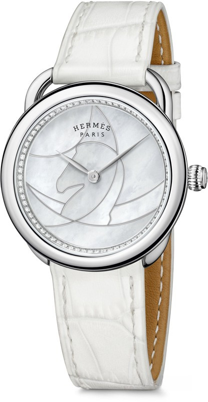 Часы Hermes Arceau Cavales представлены в корпусе из нержавеющей стали диаметром 36 мм водонепроницаемостью 30 метров. Внутри корпуса установлен кварцевый механизм. На белом жемчужном циферблате с белыми бриллиантами отображаются часы и минуты. Часы поставляются на ремешке из кожи аллигатора с вставкой из нержавеющей стали.