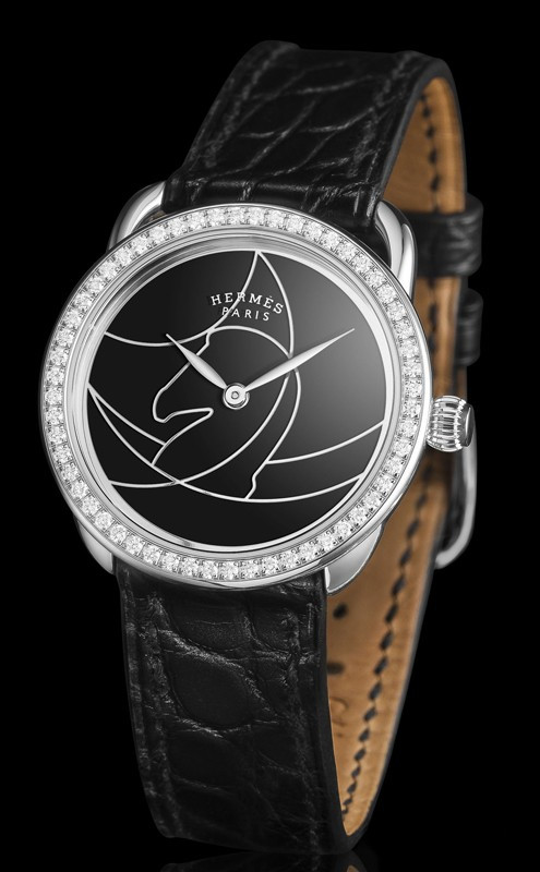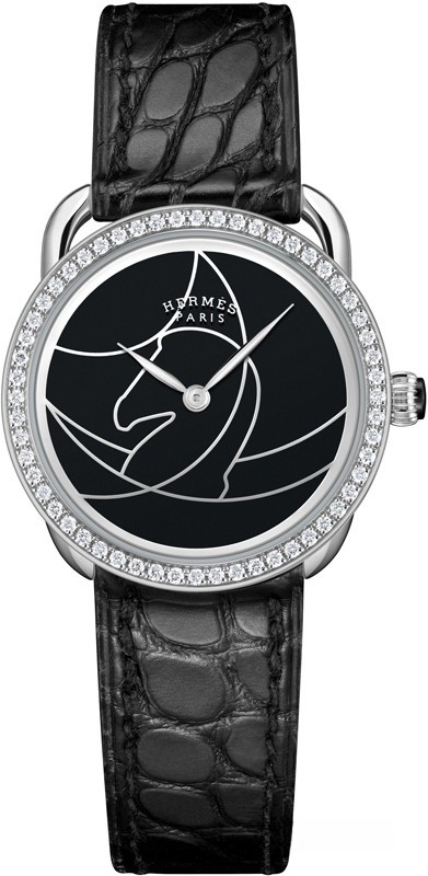 Часы Hermes Arceau Cavales представлены в корпусе из нержавеющей стали диаметром 28 мм водонепроницаемостью 30 метров. Внутри корпуса установлен кварцевый механизм. На черном циферблате отображаются часы и минуты. Часы поставляются на ремешке из кожи аллигатора с вставкой из нержавеющей стали. Безель из белых бриллиантов.