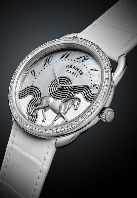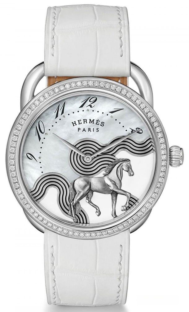 Часы Hermes Arceau Cheval Cosmique представлены в корпусе диаметром 38 мм из белого золота 18к водонепроницаемостью 30 метров. Внутри корпуса находится автоматический механизм, Калибр Hermes H1912, обладающий запасом хода 50 часов. На белом жемчужном циферблате с изображением лошади отображаются часы и минуты. Часы поставляются на ремешке из кожи аллигатора с вставкой из белого золота 18к. Безель из 82-х белых бриллиантов. Часы выпущены ограниченной серией 24 штуки.