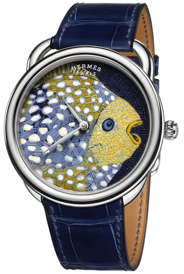 Часы Arceau Grands Fonds от Hermes представлены в круглом золотом корпусе. Главным украшением новинки является циферблат, выполненный в технике микромозаики. На синем фоне выделяется яркая экзотическая рыба, фрагмент орнамента шарфа «Grands Fonds», созданного в 1992 году французской художницей Анни Фавре. Ее доскональная техника и богатое воображение отражены в микрокосме из цветного стекла, созданном мастерами Hermès. На циферблате отображаются часы и минуты. Внутри корпуса установлен автоматический механизм, Калибр Hermès H1837. Корпус диаметром 41 мм с прозрачной задней крышкой изготовлен из белого золота 18к. Часы комплектуются синим ремешком из кожи аллигатора. Модель Arceau Grands Fonds выпущена ограниченной серией 6 штук.