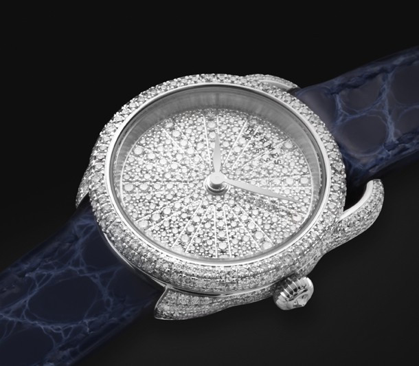 Компания Hermes представила новинку Arceau Oursin. Часы выпущены в корпусе из белого золота 18к, отделанном 289-ю белыми бриллиантами общим весом 0.89 карата. Круглый корпус диаметром 23 мм покрыт сапфировым стеклом. Специальное покрытие защищает от бликов. Заводная головка инкрустирована бриллиантом огранки «роза» весом 0.02 карата. Водонепроницаемость корпуса составляет 30 метров. Циферблат из белого золота 18к полностью инкрустирован 228-ю белыми бриллиантами общим весом 0.57 карата. Часы комплектуются кварцевым механизмом, изготовленным в Швейцарии. Калибр толщиной 1.95 мм поддерживает отображение часов и минут при помощи центральных стрелок. Новинка поставляется на ремешке из гладкой кожи аллигатора цвета синего сапфира с застежкой из белого золота 18к.