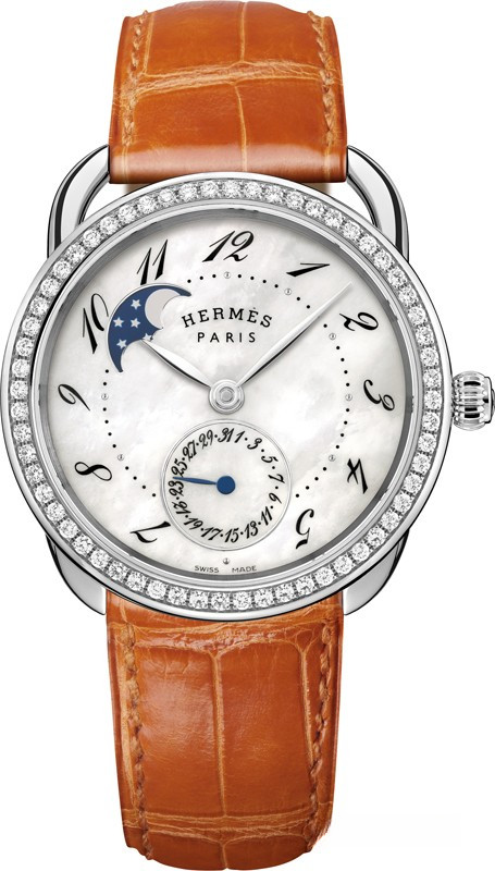 Часы Hermes Arceau Petite Lune представлены в корпусе из нержавеющей стали размером 38 мм водонепроницаемостью 30 метров. Внутри корпуса установлен автоматический механизм, Калибр Hermes H1837, обладающий запасом хода 50 часов. На белом жемчужном циферблате отображаются часы, минуты, дата, фаза луны. Часы поставляются на ремешке из кожи аллигатора с вставкой из нержавеющей стали. Безель из белых бриллиантов.