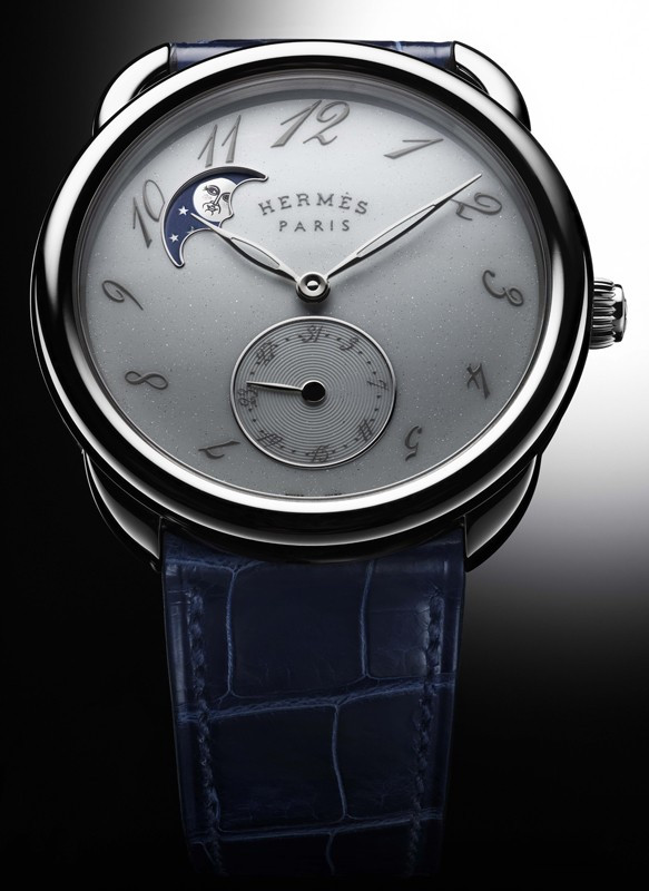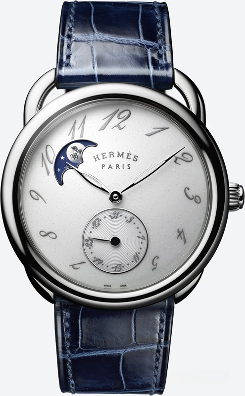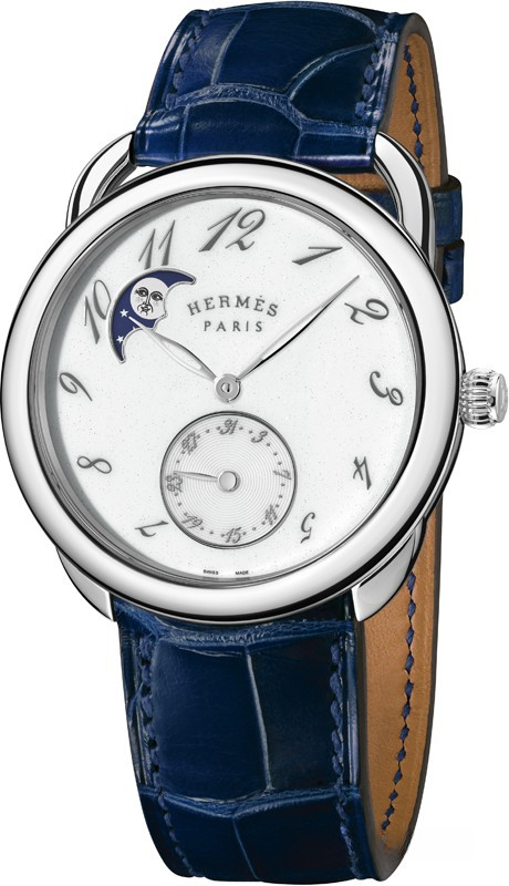 Часы Hermes Arceau Petite Lune представлены в корпусе из нержавеющей стали размером 38 мм водонепроницаемостью 30 метров. Внутри корпуса установлен автоматический механизм, Калибр Hermes H1837, обладающий запасом хода 50 часов. На белом циферблате отображаются часы, минуты, дата, фаза луны. Часы поставляются на ремешке из кожи аллигатора с вставкой из нержавеющей стали.