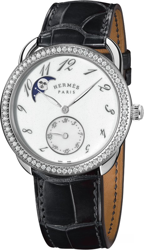 Часы Hermes Arceau Petite Lune представлены в корпусе из нержавеющей стали размером 38 мм водонепроницаемостью 30 метров. Внутри корпуса установлен автоматический механизм, Калибр Hermes H1837, обладающий запасом хода 50 часов. На белом циферблате отображаются часы, минуты, дата, фаза луны. Часы поставляются на ремешке из кожи аллигатора с вставкой из нержавеющей стали. Безель из белых бриллиантов.