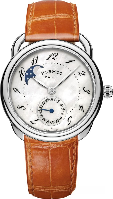 Часы Hermes Arceau Petite Lune представлены в корпусе из нержавеющей стали размером 38 мм водонепроницаемостью 30 метров. Внутри корпуса установлен автоматический механизм, Калибр Hermes H1837, обладающий запасом хода 50 часов. На белом жемчужном циферблате отображаются часы, минуты, дата, фаза луны. Часы поставляются на ремешке из кожи аллигатора с вставкой из нержавеющей стали.