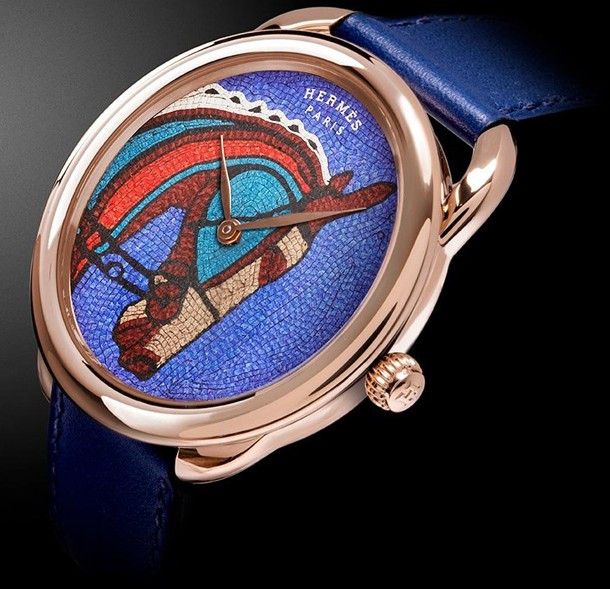 В 2018 году часы Arceau Robe du Soir, пропитанные наследием Hermes, получили новую реализацию в ограниченной серии из 12 экземпляров. Слово «мозаика» вызывает в воображении образ игры искусства и света, точную сборку разноцветных фрагментов, сочетание которых образует художественный мотив. Полтора года исследований и разработок были посвящены разработке процесса, который десятки лет был в забвении. В течение нескольких недель ремесленник терпеливо занимался миниатюрным произведением искусства, состоящим из тысяч разноцветных кожаных квадратов. Было вырезано не менее 3500 мелких деталей из тщательно отобранной крупнозернистой телячьей кожи, прежде чем вписаться в маленькое пространство циферблата. Рисунок изобразил профиль лошади, который ранее украшал шелковый шарф Hermes «Robe du Soir» Флоренс Манлик в 2018 году. В общей сложности 2200 крошечных кожаных квадратов образуют конный мотив, украшающий циферблат. Часы с корпусом из розового золота 18к имеют диаметр 41 мм. Лошадь изображена в ярких оттенках на сочном синем фоне. В этом же оттенке изготовлен ремешок из телячьей кожи. В центре циферблата расположены часовая и минутная стрелки. Часы комплектуются автоматическим мануфактурным механизмом, которым можно любоваться через сапфировое стекло.