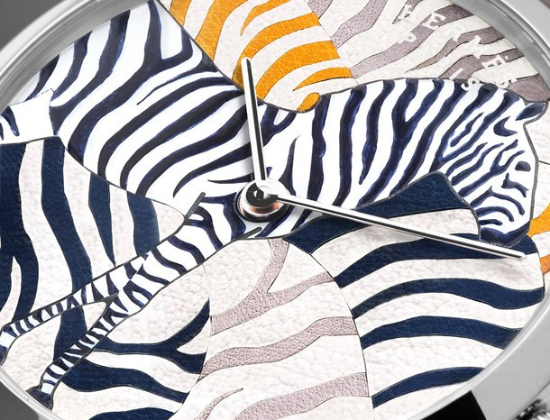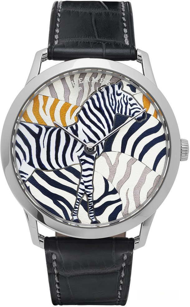 В 2018 году часы Hermes Les Zebres de Tanzanie, пропитанные наследием Hermes, получили новую реализацию в ограниченной серии из 12 экземпляров. Слово «мозаика» вызывает в воображении образ игры искусства и света, точную сборку разноцветных фрагментов, сочетание которых образует художественный мотив. Полтора года исследований и разработок были посвящены разработке процесса, который десятки лет был в забвении. В течение нескольких недель ремесленник терпеливо занимался миниатюрным произведением искусства, состоящим из разноцветных кожаных отрезков. Часы с корпусом из белого золота 18к имеют диаметр 39.5 мм. В центре циферблата с мотивом 'зебра' расположены часовая и минутная стрелки. Часы комплектуются автоматическим мануфактурным механизмом, которым можно любоваться через сапфировое стекло. Часы поставляются на ремешке из кожи аллигатора с вставкой из белого золота 18к.