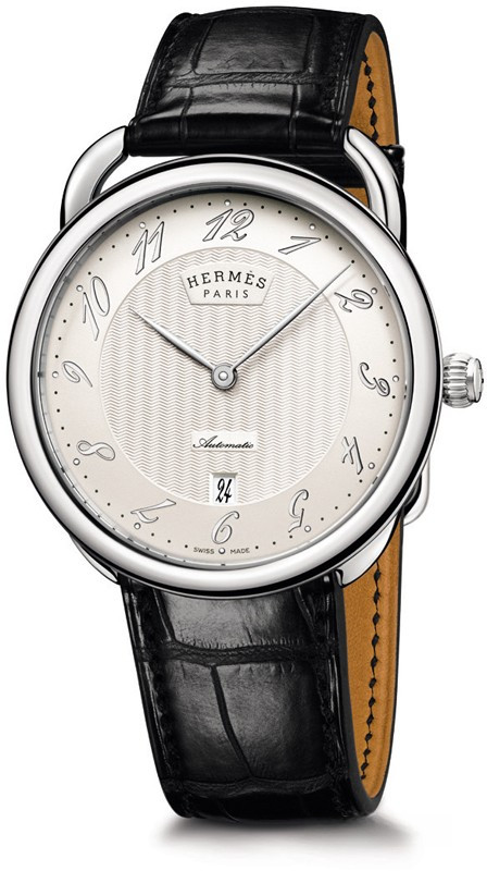 Часы Hermes Arceau Automatique 40 mm представлены в корпусе из нержавеющей стали диаметром 40 мм водонепроницаемостью 30 метров. Внутри корпуса установлен автоматический механизм, Калибр H1837, обладающий запасом хода 50 часов. На серебристом гильошированном циферблате отображаются часы, минуты и дата. Часы поставляются на ремешке из кожи аллигатора с вставкой из нержавеющей стали.