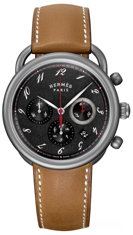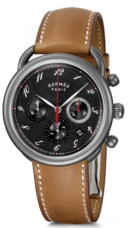 Часы Hermes Arceau Chrono Titane представлены в корпусе из титана диаметром 41 мм водонепроницаемостью 30 метров. Внутри корпуса установлен автоматический механизм, обладающий запасом хода 42 часа. На черном циферблате отображаются часы, минуты, секунды и дата. Часы поставляются на кожаном ремешке с титановой вставкой.