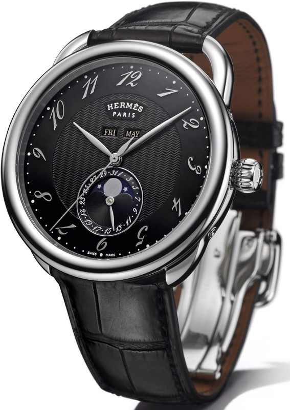 Часы Hermes Arceau Grande Lune представлены в корпусе из нержавеющей стали диаметром 43 мм водонепроницаемостью 30 метров. Внутри корпуса установлен автоматический механизм, Калибр Dubois-Dépraz 9313 Large Moon. На черном гильошированном циферблате отображаются часы, минуты, секунды, дата, день недели, месяц, фаза луны. Часы поставляются на кожаном ремешке с вставкой из нержавеющей стали.