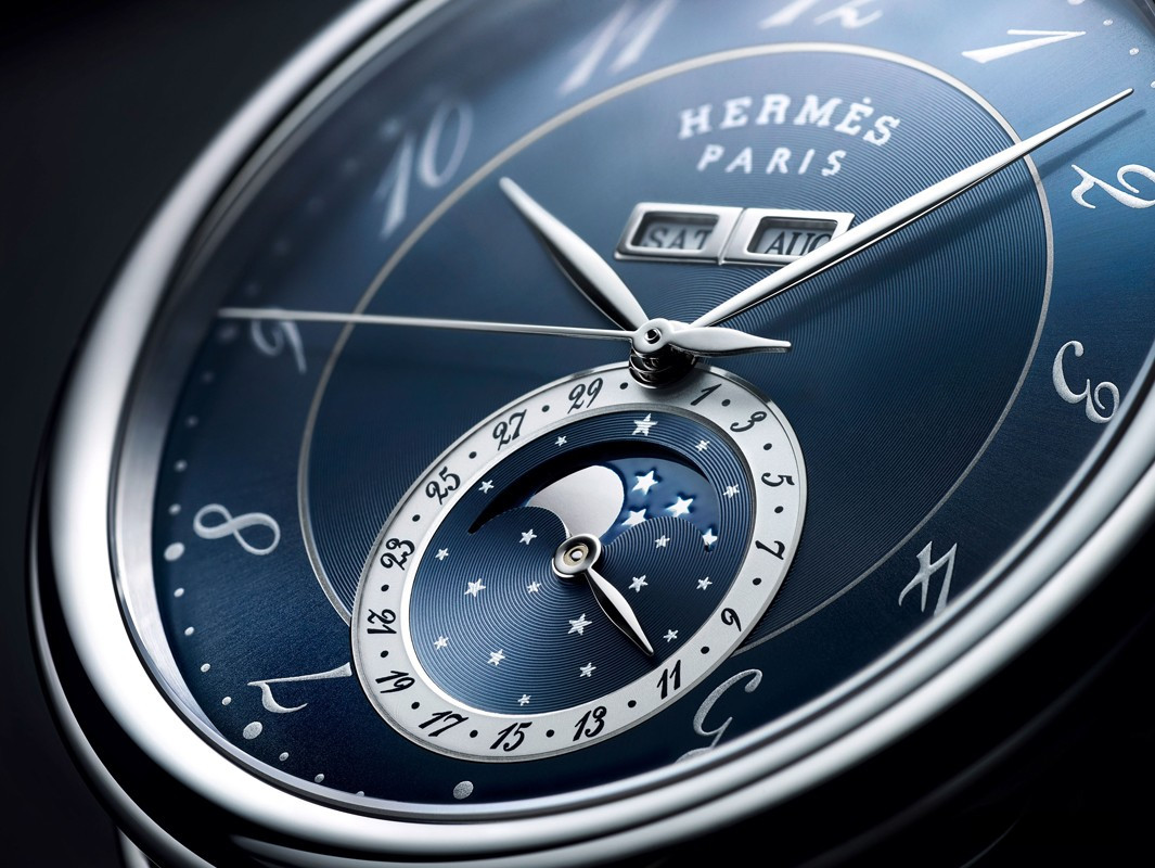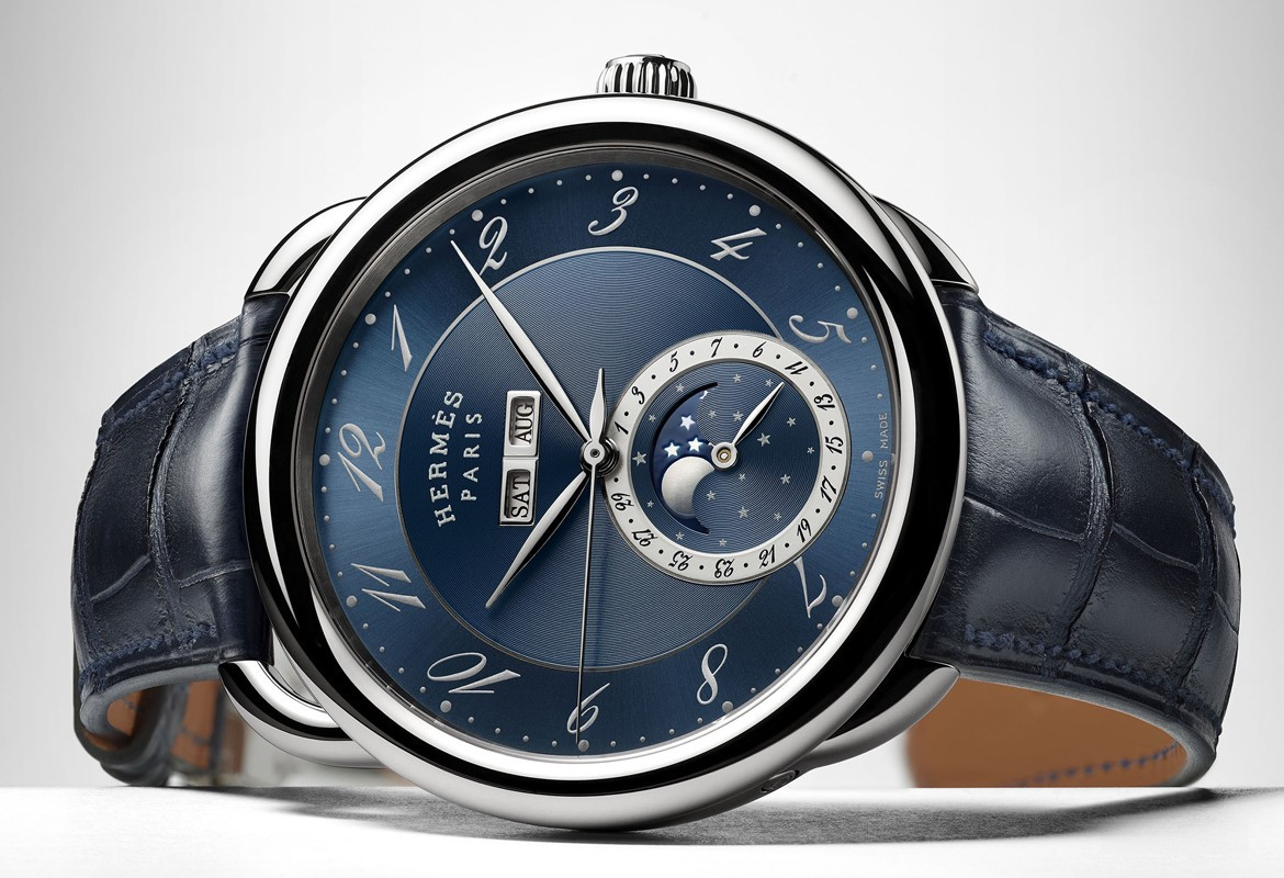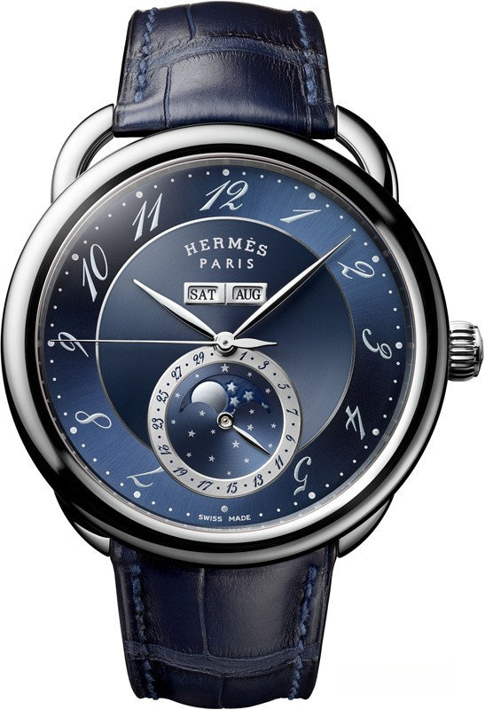 Часы Hermes Arceau Grande Lune представлены в корпусе из нержавеющей стали диаметром 43 мм водонепроницаемостью 30 метров. Внутри корпуса установлен автоматический механизм, Калибр Dubois-Dépraz 9313 Large Moon. На синем циферблате отображаются часы, минуты, секунды, дата, день недели, месяц, фаза луны. Часы поставляются на кожаном ремешке с вставкой из нержавеющей стали.