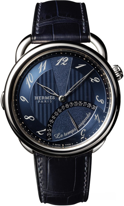 Часы Hermes Arceau Le Temps Suspendu представлены в корпусе из платины 950 диаметром 43 мм водонепроницаемостью 30 метров. Внутри корпуса установлен автоматический механизм, обладающий запасом хода 42 часа. На синем гильошированном циферблате отображаются часы, минуты, секунды. Часы поставляются на ремешке из кожи аллигатора с вставкой из платины 950.