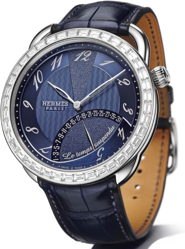 Часы Hermes Arceau Le Temps Suspendu представлены в корпусе из платины 950 диаметром 43 мм водонепроницаемостью 30 метров. Внутри корпуса установлен автоматический механизм, обладающий запасом хода 42 часа. На синем гильошированном циферблате отображаются часы, минуты, секунды. Часы поставляются на ремешке из кожи аллигатора с вставкой из платины 950. Безель из белых багетных бриллиантов.