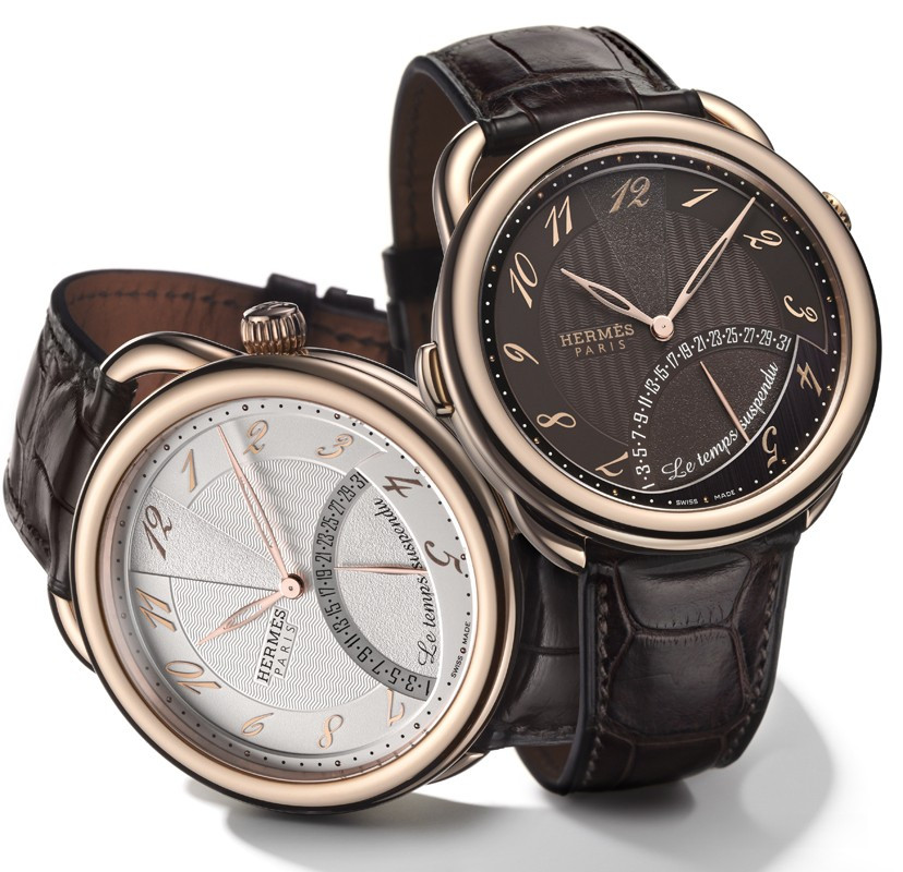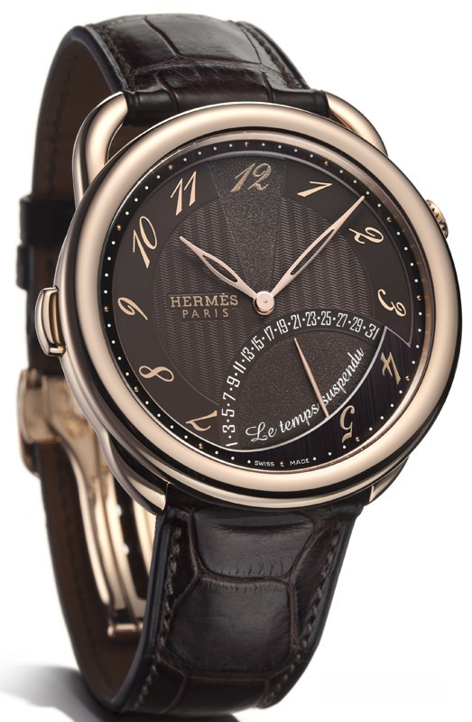 Часы Hermes Arceau Le Temps Suspendu представлены в корпусе из розового золота 18к диаметром 43 мм водонепроницаемостью 30 метров. Внутри корпуса установлен автоматический механизм, обладающий запасом хода 42 часа. На коричневом гильошированном циферблате отображаются часы, минуты, секунды. Часы поставляются на ремешке из кожи аллигатора с вставкой из розового золота 18к.