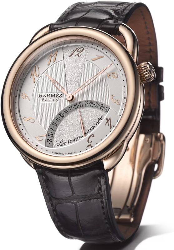 Часы Hermes Arceau Le Temps Suspendu представлены в корпусе из розового золота 18к диаметром 43 мм водонепроницаемостью 30 метров. Внутри корпуса установлен автоматический механизм, обладающий запасом хода 42 часа. На белом гильошированном циферблате отображаются часы, минуты, секунды. Часы поставляются на ремешке из кожи аллигатора с вставкой из розового золота 18к.