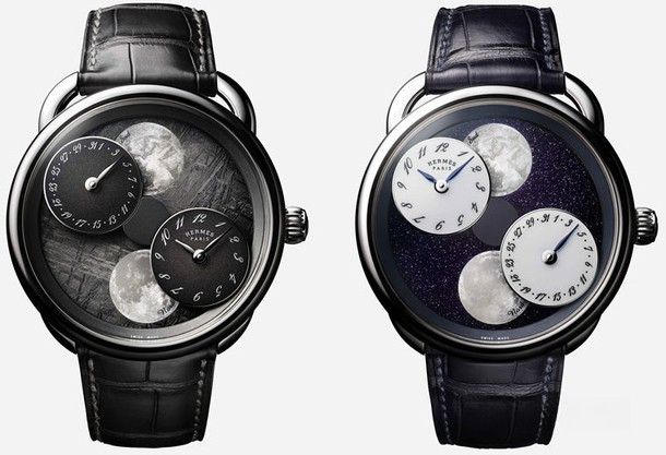 Часы Hermes Arceau L’Heure De La Lune представлены в корпусе из белого золота 18к размером 43 мм и водонепроницаемостью 30 м. Внутри корпуса установлен автоматический механизм, Калибр H1837, обладающий запасом хода 42 часа. На циферблате из серого метеорита отображаются часы, минуты, дата, фаза луны. Часы комплектуются ремешком из кожи аллигатора с вставкой из белого золота 18к. Серия ограничена - 100 штук.