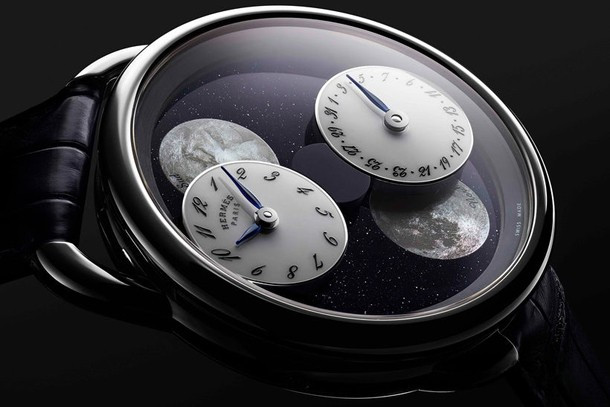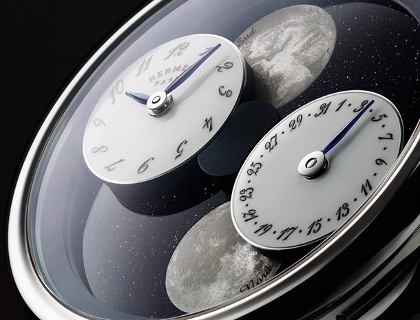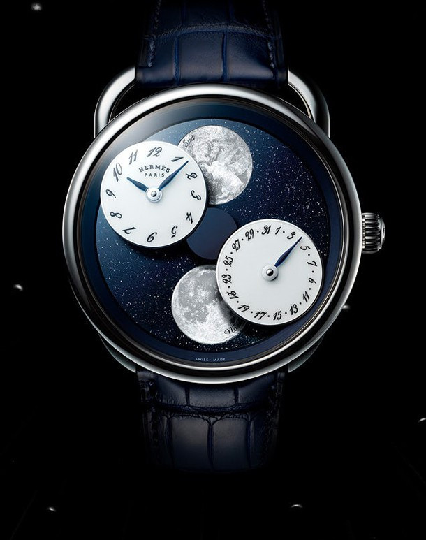 Часы Hermes Arceau L’Heure De La Lune представлены в корпусе из белого золота 18к размером 43 мм и водонепроницаемостью 30 м. Внутри корпуса установлен автоматический механизм, Калибр H1837, обладающий запасом хода 42 часа. На циферблате из синего авантюрина отображаются часы, минуты, дата, фаза луны. Часы комплектуются ремешком из кожи аллигатора с вставкой из белого золота 18к. Серия ограничена - 100 штук.