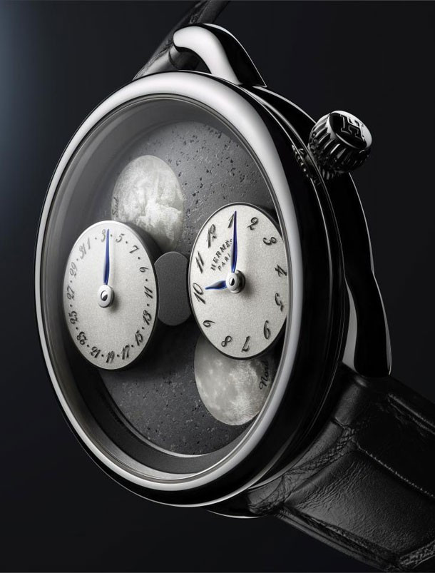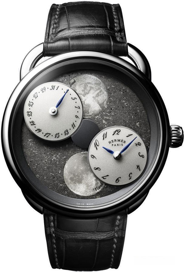 Часы Hermes Arceau L’Heure De La Lune представлены в корпусе из белого золота 18к размером 43 мм и водонепроницаемостью 30 м. Внутри корпуса установлен автоматический механизм, Калибр H1837, обладающий запасом хода 42 часа. На циферблате из черного метеорита отображаются часы, минуты, дата, фаза луны. Часы комплектуются ремешком из кожи аллигатора с вставкой из белого золота 18к. Серия ограничена - 30 штук.