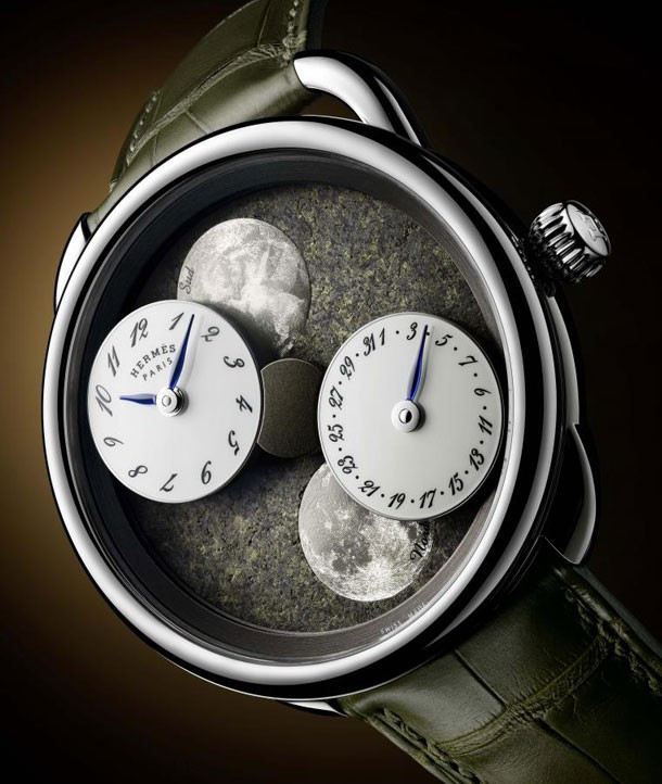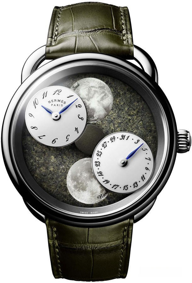 Часы Hermes Arceau L’Heure De La Lune представлены в корпусе из платины 950 размером 43 мм и водонепроницаемостью 30 м. Внутри корпуса установлен автоматический механизм, Калибр H1837, обладающий запасом хода 42 часа. На циферблате из марсианского метеорита отображаются часы, минуты, дата, фаза луны. Часы комплектуются ремешком из кожи аллигатора с вставкой из платины 950. Серия ограничена - 2 штуки.