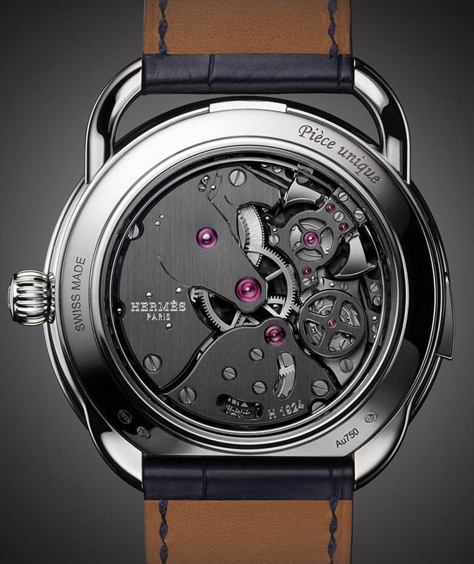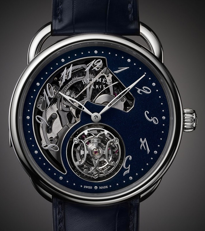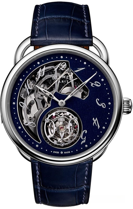 Часы Hermes Arceau Lift Tourbillon Repetition Minutes представлены в корпусе из белого золота 18к размером 43 мм водонепроницаемостью 30 метров. Внутри корпуса установлен механизм с ручным заводом, Калибр H1924, обладающий запасом хода 90 часов. На синем скелетированном циферблате отображаются часы, минуты, турбийон. Часы поставляются на ремешке из кожи аллигатора с вставкой из белого золота 18к. Серия ограничена - 1 шт.