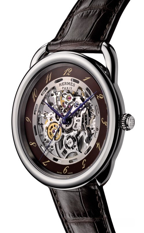 Часы Arceau от Hermès раскрывают свое механическое сердце с ажурной отделкой через сапфировое стекло на циферблате. Круглый 41-миллиметровый корпус из нержавеющей стали скелетона Hermès Arceau отполирован и отличается характерными асимметричными ушками в стиле стремя. Современная отделка швейцарского автоматического механизма, приводящего в действие часы и минуты, видна под сапфировым стеклом. Ажурные мосты и основная пластина обработаны круговой зернистостью, а антрацитовые шестерни меняют свой оттенок в зависимости от освещения. Баланс скелетирован и имеет стилизованную литеру H. Механизм создан н абазе Калибра Sellita SW 300. Балансовая частота составляет 28 800 пк/час, запас хода 42 часа. Arceau Squelette комплектуется ремешком из кожи аллигатора. Каждый ремешок прошивается вручную характерным седельным швом и изготавливается одним и тем же мастером от начала до конца.