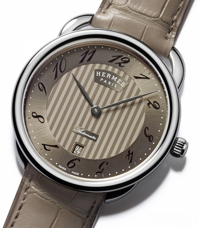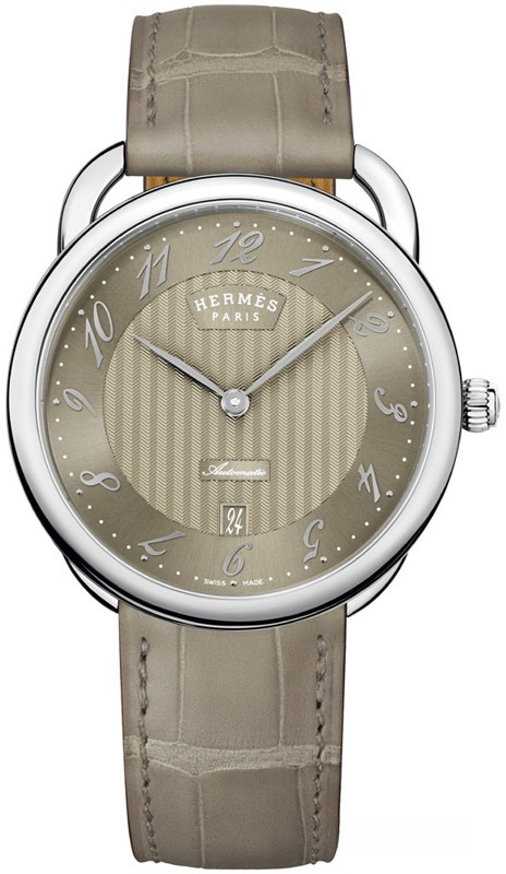 Часы Hermes Arceau TGM представлены в корпусе из нержавеющей стали размером 40 мм водонепроницаемостью 30 метров. Внутри корпуса находится автоматический механизм, Калибр H1837, обладающий запасом хода 50 часов. На бежевом гильошированном циферблате отображаются часы, минуты, дата. Часы поставляются на ремешке из кожи аллигатора с вставкой из нержавеющей стали.
