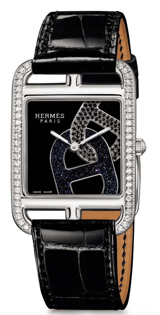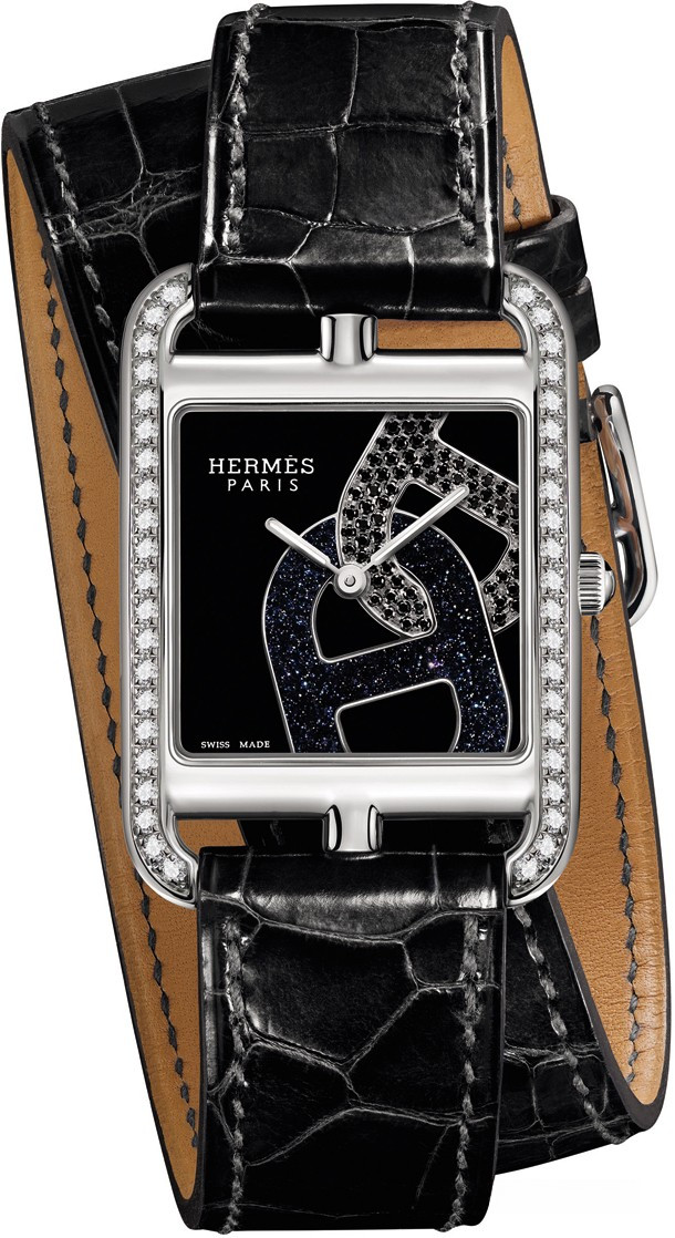 Новая модель Cape Cod – яркое звено в цепочке стилистических изысков и смелая трактовка женственности. В этой версии большого размера из стали мотив якорной цепи, придуманный Робером Люма в 1938 году, ставит традиционное часовое мастерство на службу творчеству. Часы Cape Cod вводят новую трактовку звена якорной цепи. На фоне черного лака сплетаются в орнаментальном мотиве авантюрин и черная шпинель. Современную типографику со сдвинутым относительно центра логотипом подчеркивают тонкие стрелки и прямоугольный инкрустированный безель. Непринужденно-элегантная модель крепится на женском запястье ремешком из кожи аллигатора в тон циферблату – в один или два оборота.