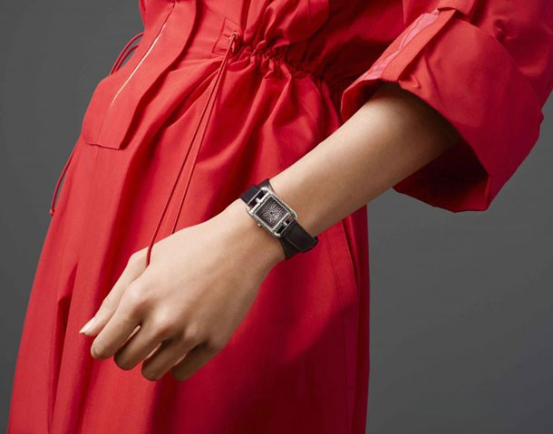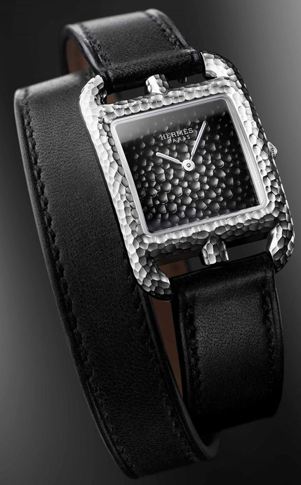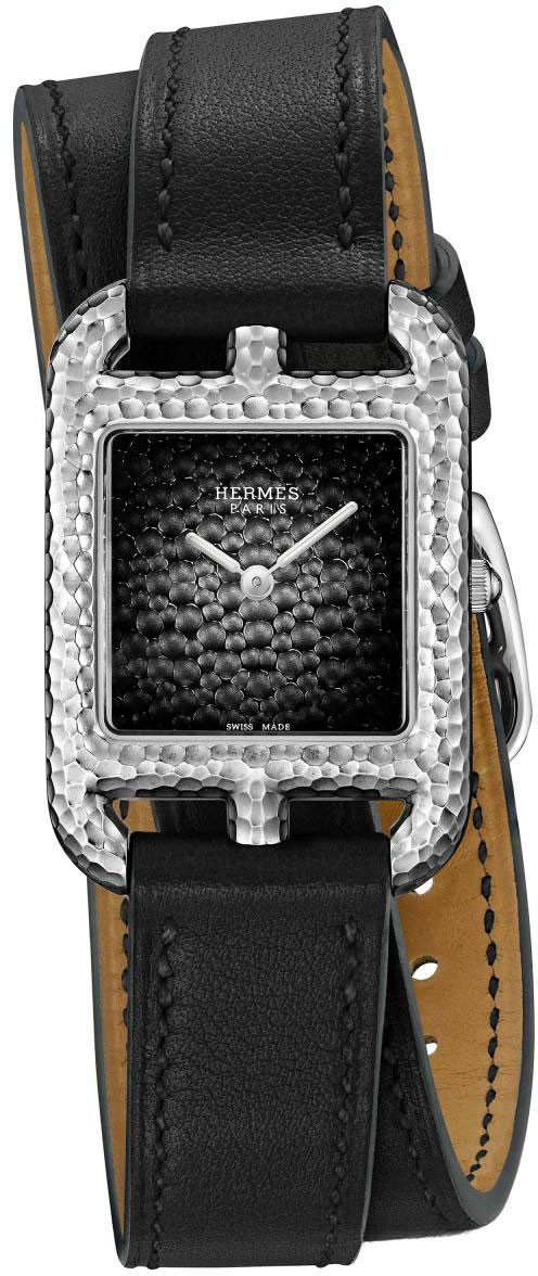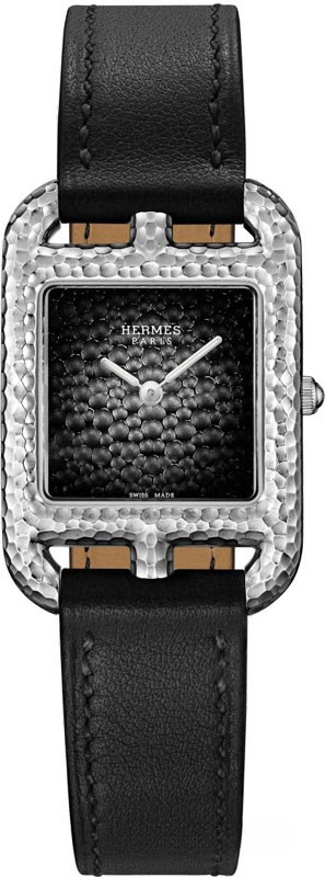 Часы Hermes Cape Cod Martelee представлены в корпусе размером 23 х 23 мм из нержавеющей стали водонепроницаемостью 30 метров. Внутри корпуса установлен кварцевый механизм. На черном циферблате отображаются часы и минуты. Часы поставляются на кожаном ремешке с вставкой из нержавеющей стали.