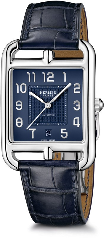 Часы Hermes Cape Cod TGM Manufacture представлены в корпусе из нержавеющей стали размером 33 х 33 мм водонепроницаемостью 30 метров. Внутри корпуса находится автоматический механизм, Калибр H1912, обладающий запасом хода 50 часов. На синем циферблате отображаются часы, минуты, секунды, дата. Часы поставляются на ремешке из кожи аллигатора с вставкой из нержавеющей стали.