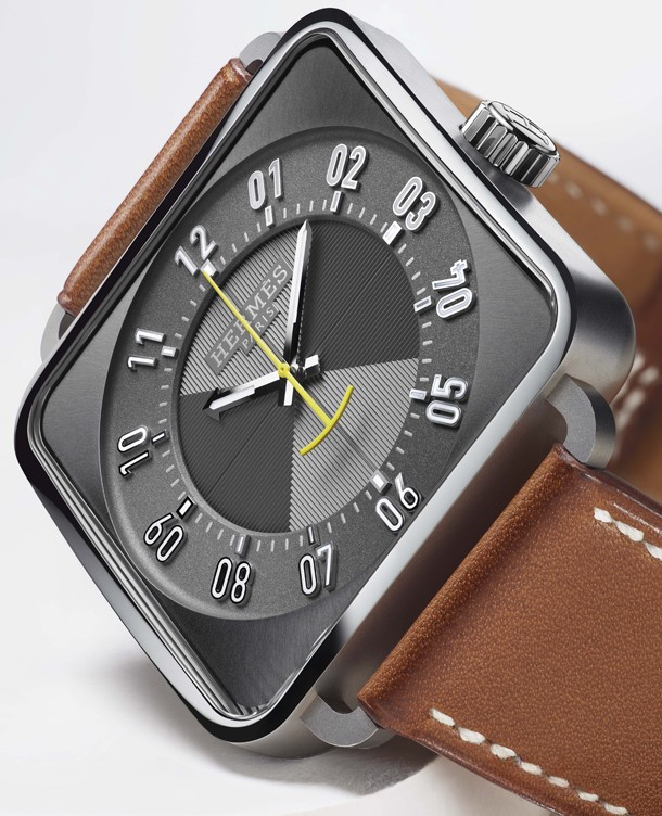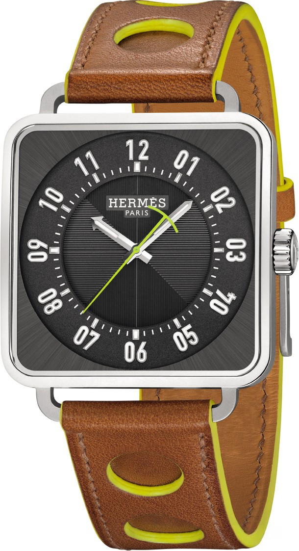 Часы Carré H, созданные Марком Бертье в 2010 году, представлены в новой версии на кожаном ремешке с перфорированным узором и окантовкой яркого цвета. «Архитектурные часы» Carré H обрели спортивную нотку благодаря новому ремешку из телячьей кожи Barénia черного или натурального цвета с перфорированным узором, повторяющим форму часовой шкалы на циферблате. Яркая красная или желтая окантовка перекликается с секундной стрелкой того же цвета, вращающейся над черным или серым циферблатом с гильошированной и зерненой отделками. Кожаный ремешок с перфорацией и эффектным окаймлением, изготовленный в часовых мастерских Hermès в Бругге, акцентирует характерную эстетику Carré H. Современный дизайн модели подчеркивает квадратный корпус с округленными углами из полированной стали, прошедшей микроструйную обработку. Безупречную читаемость показаний обеспечивает минималистское исполнение циферблата со стрелками и цифрами с люминесцентным покрытием и стеклом цилиндрической формы. Лаконичная и смелая версия часов Carré H продолжает историю знакомства французского дизайнера и архитектора с искусством шорников и кожевенных дел мастеров Дома Hermès.