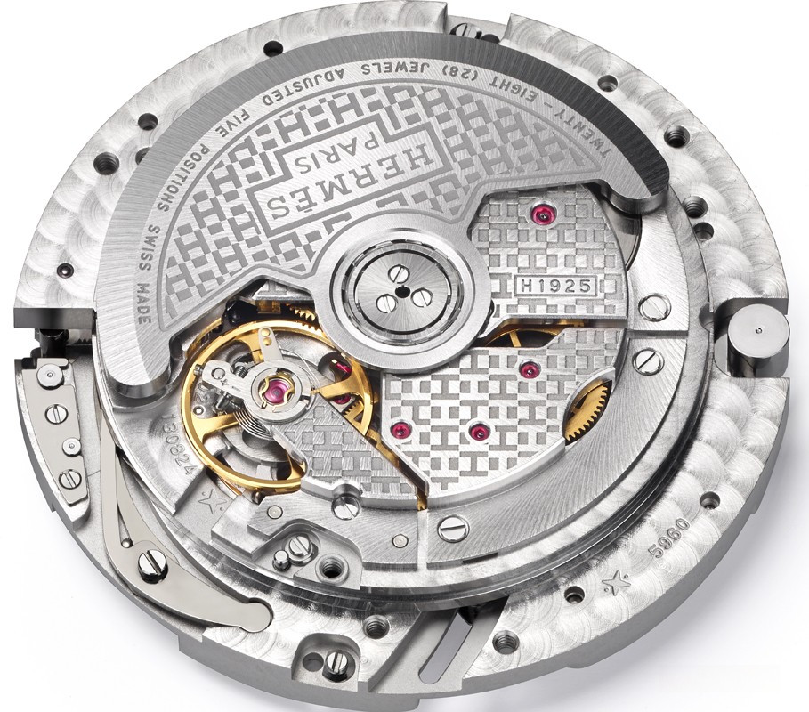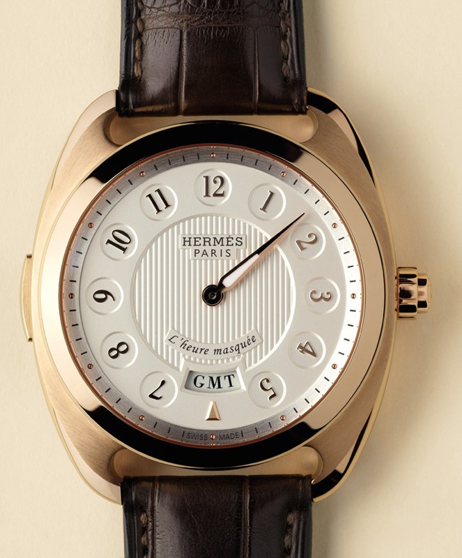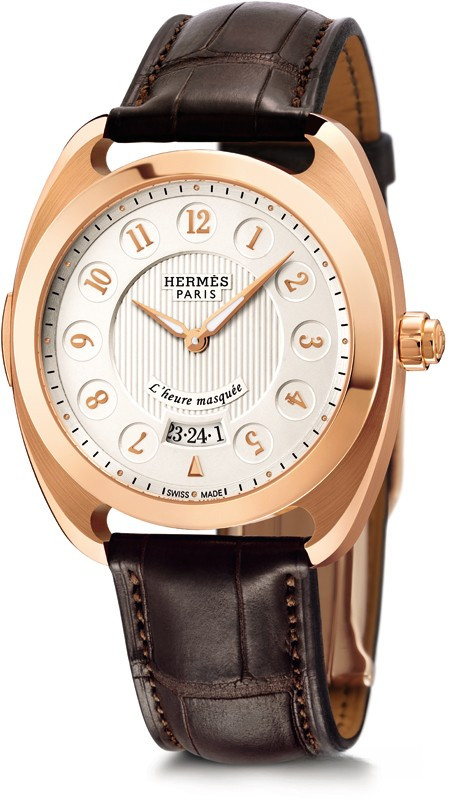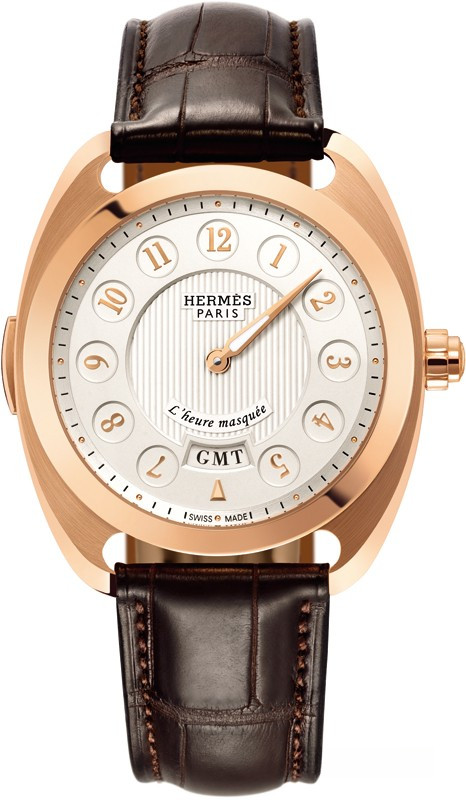 Часы Hermes Dressage l Heure Masquee представлены в корпусе из розового золота 18к размером 40.5 х 38.4 мм водонепроницаемостью 50 метров. Внутри корпуса находится автоматический механизм, Калибр H1925, обладающий заасом хода 45 часов. На серебристом гильошированном циферблате отображаются часы, минуты, дата, время второго часового пояса. Часы поставляются на ремешке из кожи аллигатора с вставкой из розового золота 18к. Серия ограничена - 500 шт.