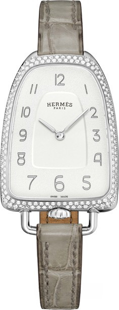 Часы Hermes Galop d’Hermes представлены в корпусе из нержавеющей стали размером 40.8 х 26 мм. Водонепроницаемость составляет 30 м. Внутри корпуса установлен кварцевый механизм с индикацией часов и минут на белом циферблате при помощи центральных стрелок. Заводная головка расположена на 6-ти часах. Часы поставляются на ремешке из кожи аллигатора с вставкой из нержавеющей стали. Безель инкрустирован белыми бриллиантами.