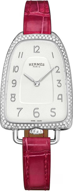 Часы Hermes Galop d’Hermes представлены в корпусе из нержавеющей стали размером 40.8 х 26 мм. Водонепроницаемость составляет 30 м. Внутри корпуса установлен кварцевый механизм с индикацией часов и минут на белом циферблате при помощи центральных стрелок. Заводная головка расположена на 6-ти часах. Часы поставляются на ремешке из кожи аллигатора с вставкой из нержавеющей стали. Безель инкрустирован белыми бриллиантами.