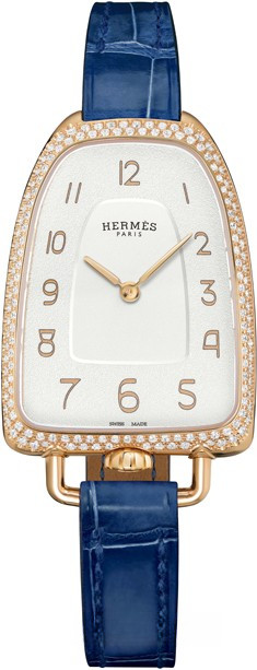 Часы Hermes Galop d’Hermes представлены в корпусе из розового золота 18к размером 40.8 х 26 мм. Водонепроницаемость составляет 30 м. Внутри корпуса установлен кварцевый механизм с индикацией часов и минут на белом циферблате при помощи центральных стрелок. Заводная головка расположена на 6-ти часах. Безель инкрустирован белыми бриллиантами. Часы поставляются на ремешке из кожи аллигатора с вставкой из розового золота 18к.