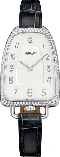 Часы Hermes Galop d’Hermes представлены в корпусе из нержавеющей стали размером 40.8 х 26 мм. Водонепроницаемость составляет 30 м. Внутри корпуса установлен кварцевый механизм с индикацией часов и минут на белом циферблате при помощи центральных стрелок. Заводная головка расположена на 6-ти часах. Часы поставляются на ремешке из кожи аллигатора с вставкой из нержавеющей стали. Безель инкрустирован белыми бриллиантами.