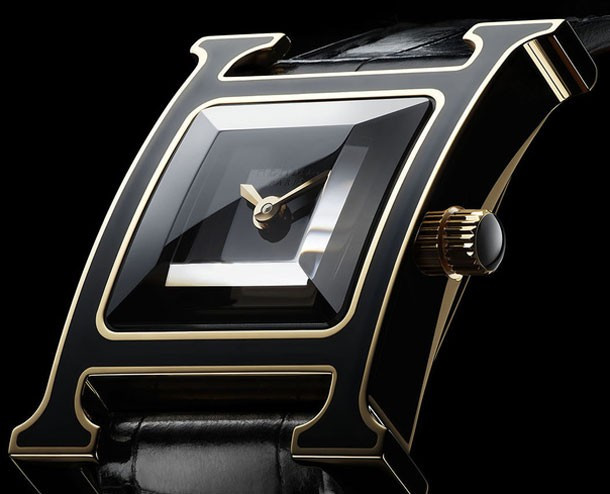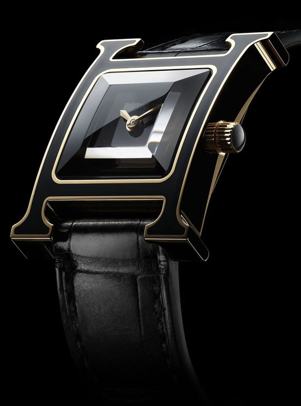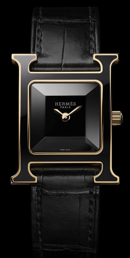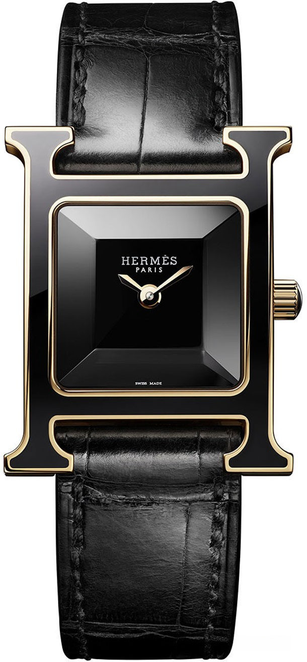 Часы Hermes Heure H Double Jeu представлены в корпусе из розового золота 18к размером 21 х 21 мм и водонепроницаемостью до 30 метров. Внутри корпуса установлен кварцевый механизм. На черном циферблате отображаются часы, минуты. Часы комплектуются ремешком из кожи аллигатора с вставкой из розового золота 18к.