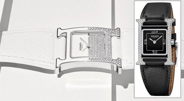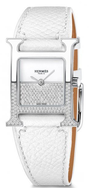 Часы Hermes Heure H Double Jeu представлены в корпусе из нержавеющей стали размером 21 х 21 мм и водонепроницаемостью до 30 метров. Внутри корпуса установлен кварцевый механизм. На белом циферблате с белыми бриллиантами отображаются часы, минуты. Часы комплектуются кожаным ремешком с вставкой из нержавеющей стали. Корпус инкрустирован белыми бриллиантами.