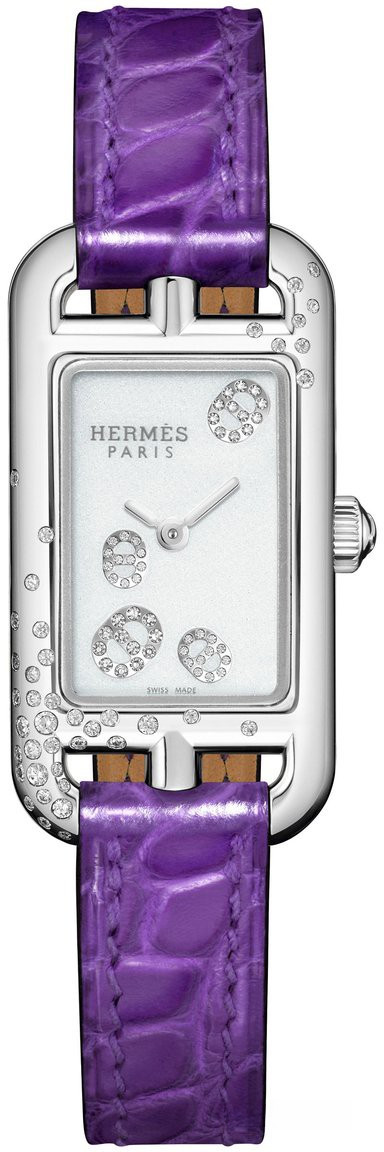 Hermes Nantucket Jete de Chaine d’Ancre - миниатюрные часы Nantucket с формой корпуса в виде якорной цепи. Циферблат и корпус сияют асимметричными вставками из белых бриллиантов. Прямоугольный стальной корпус, изготовленный в мастерских Hermès Horloger, обладает размером 17 х 23 мм. Циферблат покрыт сапфировым стеклом с антибликовым покрытием. Корпус инкрустирован 41-м белым бриллиантом общим весом 0.1 ct. Серебристый циферблат украшен 48-ю белыми бриллиантами общим весом 0.03 ct.
