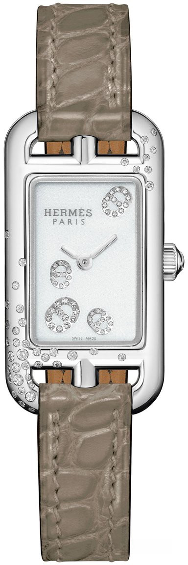 Hermes Nantucket Jete de Chaine d’Ancre - миниатюрные часы Nantucket с формой корпуса в виде якорной цепи. Циферблат и корпус сияют асимметричными вставками из белых бриллиантов. Прямоугольный стальной корпус, изготовленный в мастерских Hermès Horloger, обладает размером 17 х 23 мм. Циферблат покрыт сапфировым стеклом с антибликовым покрытием. Корпус инкрустирован 41-м белым бриллиантом общим весом 0.1 ct. Серебристый циферблат украшен 48-ю белыми бриллиантами общим весом 0.03 ct.