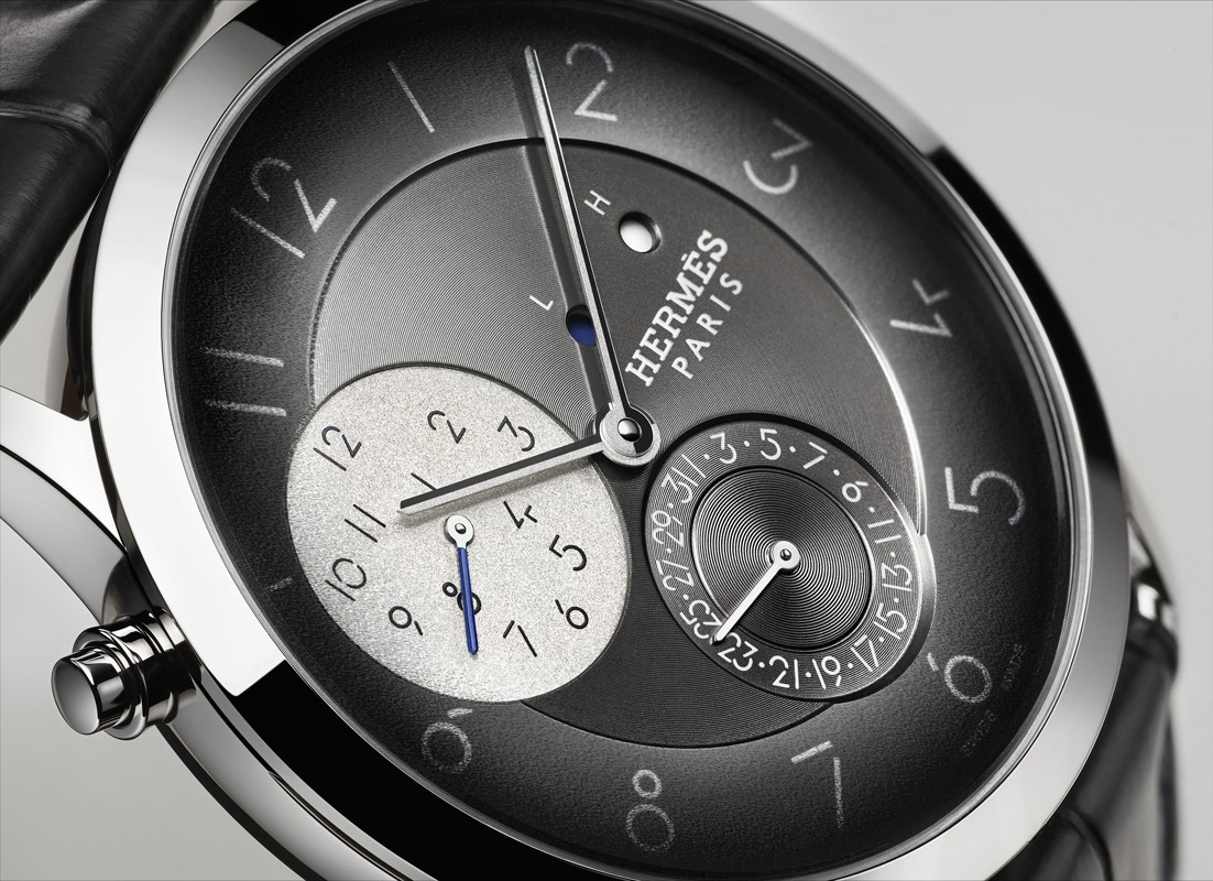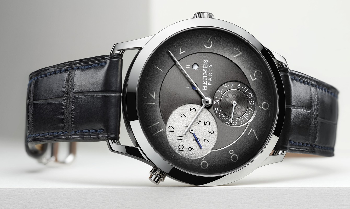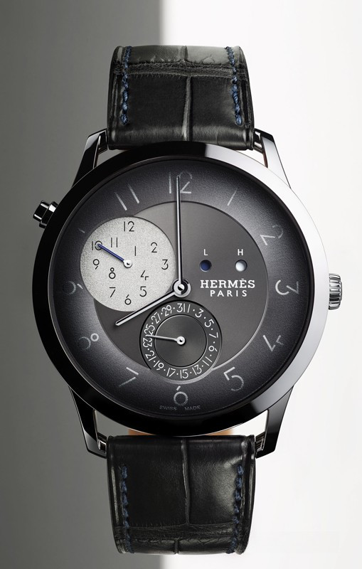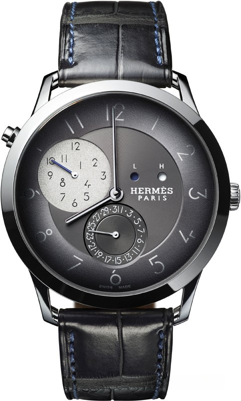 Часы Hermes Slim d'Hermes GMT представлены в корпусе диаметром 39.5 мм из палладия водонепроницаемостью 30 метров. Внутри корпуса находится автоматический механизм, Калибр Hermes H1950, обладающий запасом хода 42 часа. На черном циферблате отображаются часы, минуты, дата, индикатор день/ночь, время второго часового пояса. Часы поставляются на ремешке из кожи аллигатора с вставкой из палладия. Серия ограничена - 120 шт.