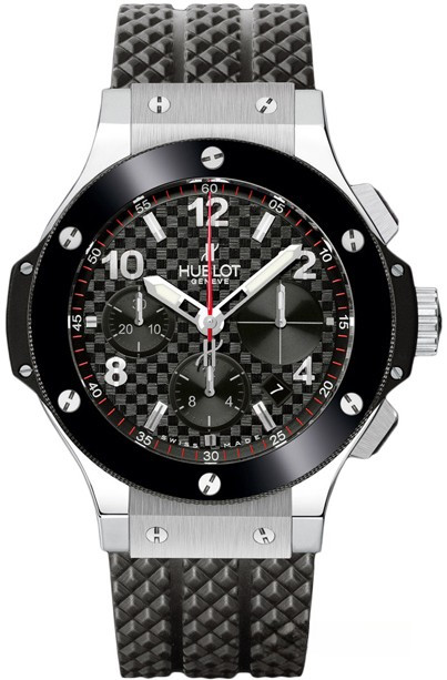 Часы Hublot Big Bang 41mm Steel Ceramic 342.SB.131.RX обладают круглым корпусом из нержавеющей стали и керамики, диаметром 41 мм, водонепроницаемостью до 30 м. На торце рифленой заводной головки, расположенной на 3 часах, имеется логотип в виде большой буквы Н. Сапфировое стекло установлено на передней стороне часового корпуса (с антибликовым покрытием) и на его завинчивающейся задней крышке. Циферблат черно-серого цвета из `углеродного волокна` и со скелетированными стрелками. На циферблате симметрично расположены накопители хронографа. Модель оснащена мануфактурным швейцарским автоматическим механизмом. Калибр HUB 1145 с 42-часовым запасом хода, с функциями индикации часов и минут (посредством соответствующих центральных стрелок), секунд и даты (посредством апертуры в позиции между 4-мя и 5-ю часами). Калибр отменно отделан и декорирован. Поставляется на каучуковом ремешке с керамической вставкой.